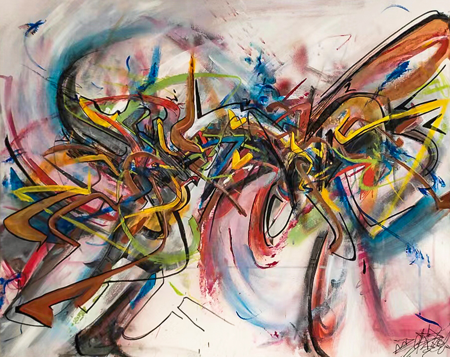 2013 – SPACE-DYNAMIC – Acrylique, posca, encre et bombe aérosol sur toile – 150x100cm – indisponible)
